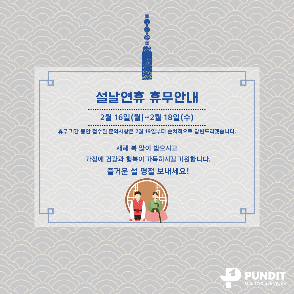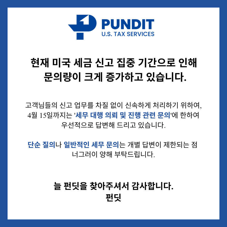PUNDIT은 전문가의 경험과 지식을 공유함으로써, 미국 세금으로 인한 불편함을 해소 시켜드리는 것을 목표로 하는 미국 개인세무서비스 전문 법인입니다.